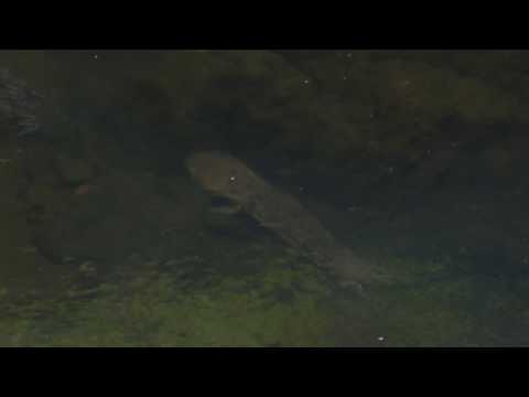 いつか見てみたいと思っていたオオサンショウウオに出会えた。 流れのある水面下にいるので、静止画、動画ともにうまく撮れなかったが、まだ動画の方がましに見えるかな? 調べてみると、夜行性らしく、観察していた40分ほどの間に動きはなかった。